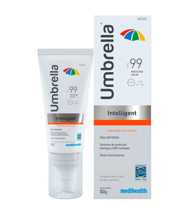 Indicado para todos os tipos de pele, o Protetor Solar Umbrella Intelligent FPS 99 com 50g possui amplo espectro e alto fator de proteção solar, a compra ideal para quem busca proteger-se do sol.